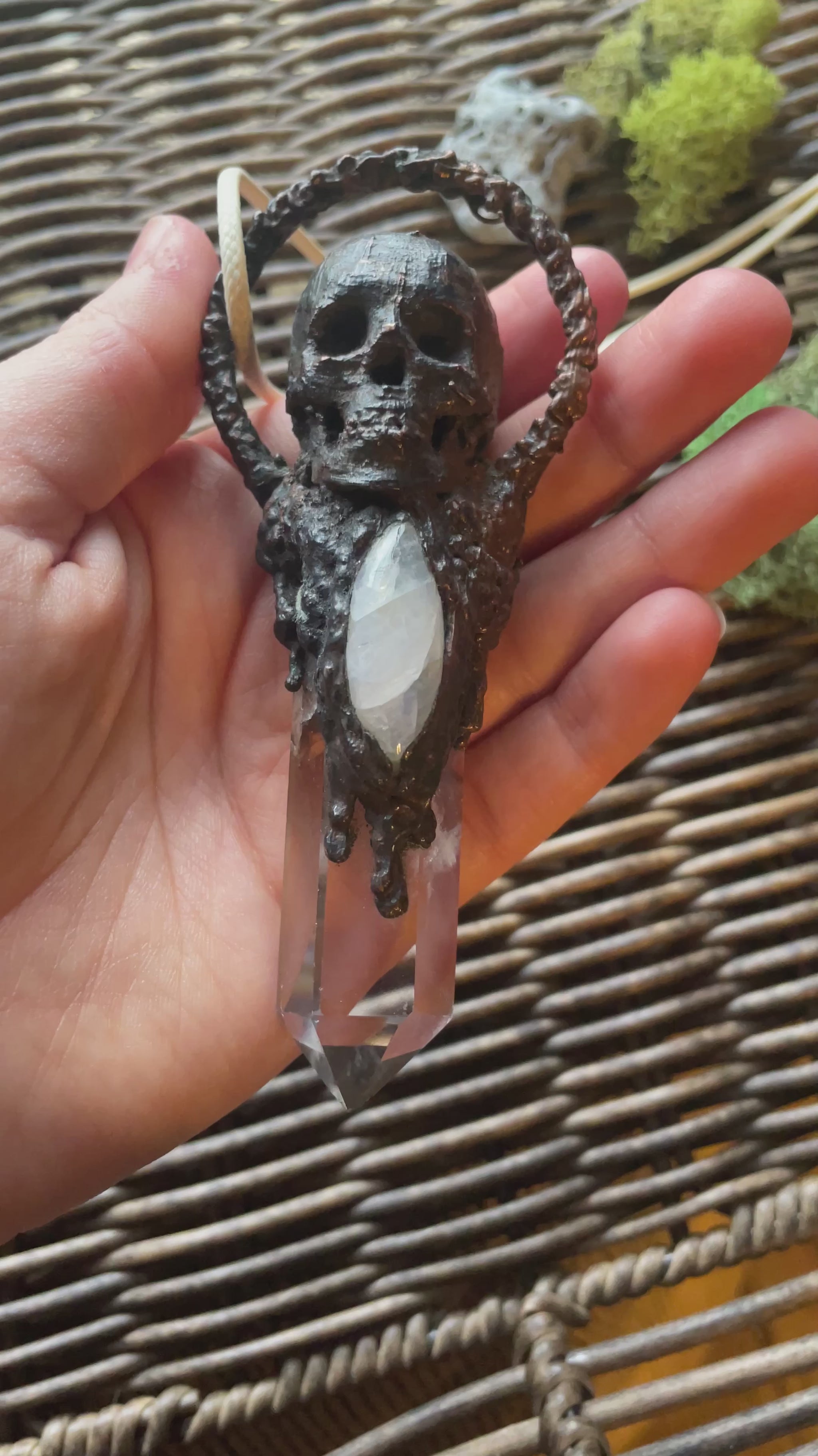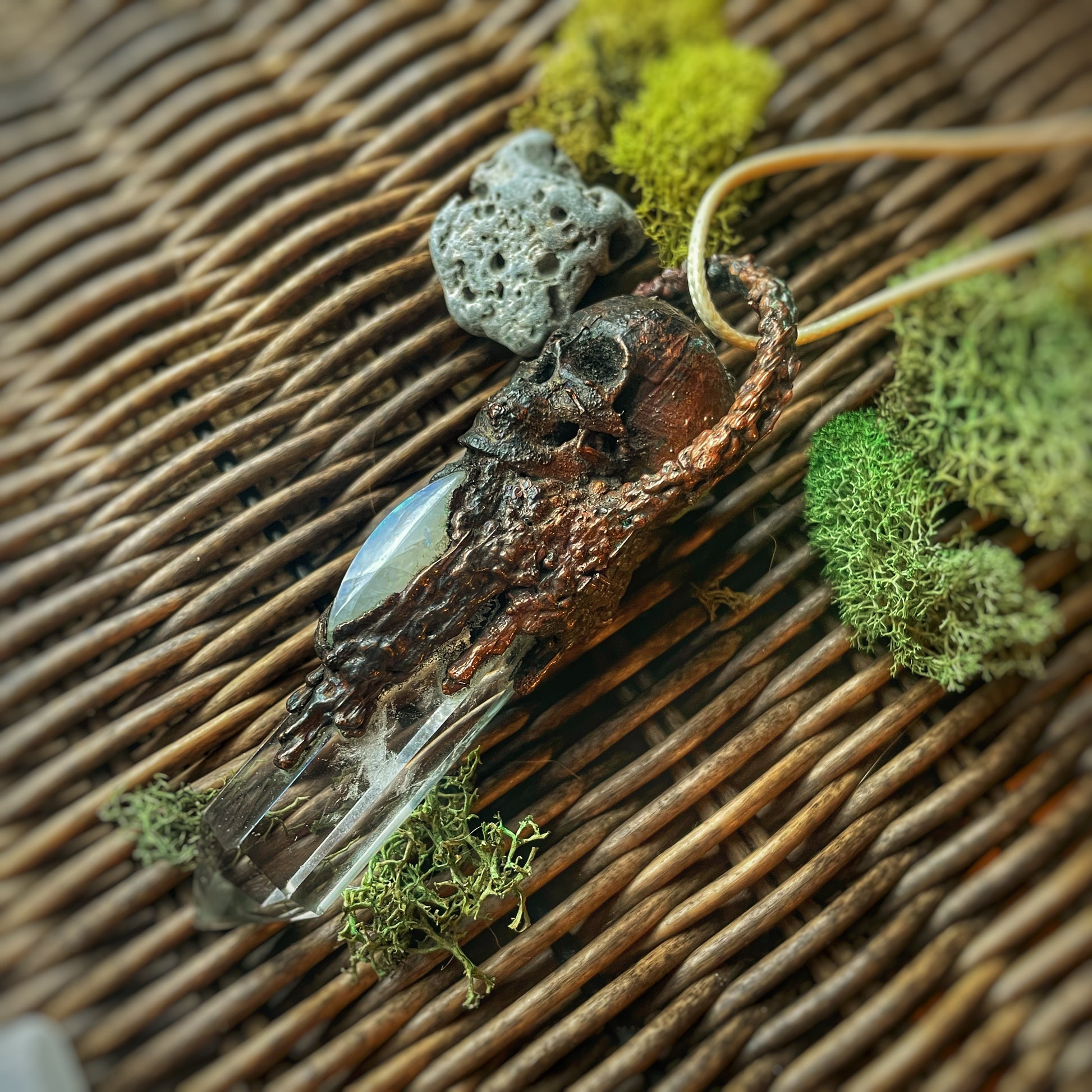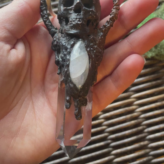 Quite the large, and heavy piece. Features a clear Quartz point, handcrafted copper skull elements, and a moonstone set into the copper.